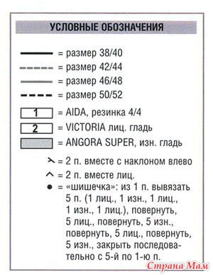 Набрать для Р1 88 п. Victoria, для Р2 96 п. Victoria, для РЗ 104 п. Angora super, для Р4118 п. Angora super и вязать по схеме (первые 2 р. платочной вязкой). В 27-м р. схемы вязать резинкой 4/4 Aida, начиная для Р1 и РЗ с 2 лиц., для Р2 с 2 изн., для Р4 с 1 лиц. Реглан (3 первые и 3 последние петли вязать лиц. гладью): для всех размеров закрыть 2 п., затем убавлять на расстоянии 3 п. от края по схеме. Для всех размеров «шишечки» выполнять на расстоянии 1 п. от края.