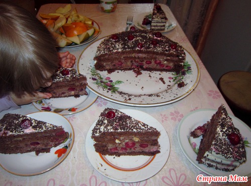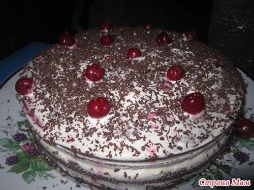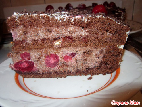 Шоколад на кипятке, один потолще выпечь, второй потоньше. Из толстого вырезала середину (оставила дно и бока), сделала крем:сметана+сахар+вишня+орехи в карамели+бисквит вырезанный, смешала и уложила в толстый, тонкий разрезала, пропитала верх вишневым сиропом, закрыла как крышкой нижний, сверху положила еще крем с вишней и укрыла верхним последним. Сверху сметана, вишня, шоколад.