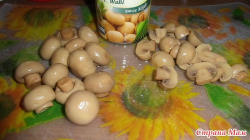 -напополам разрезаем консервированные грибы