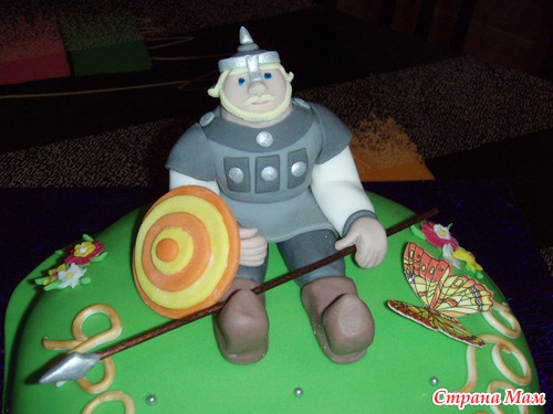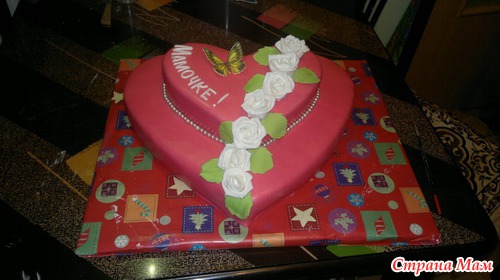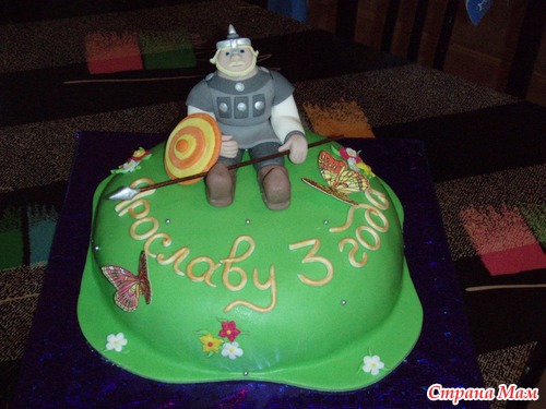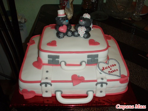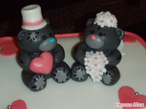 Делала тортики до Нового года и после, свадебный попросили именно такой (фото с инета нашли), Добрыня сидит, т. к времени было мало( ноги не успели бы высохнуть). Машину делала племяшу в подарок, увезли за 2 тысячи км, по прилету колеса отвалились(ну обратно сестра их конечно приделала). Сердце делала на мамин юбилей