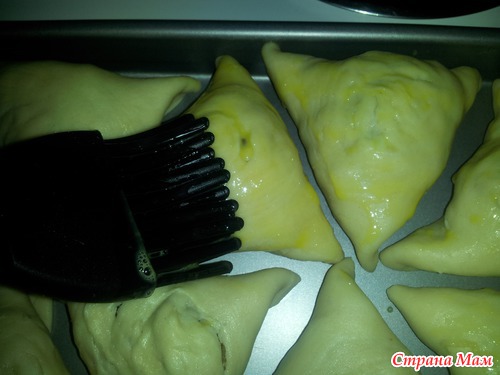 Намазываем желтком, можно сверху перчик посыпать и в духовку ставим на 200 градусов. Выпекаем 30-35 минут.