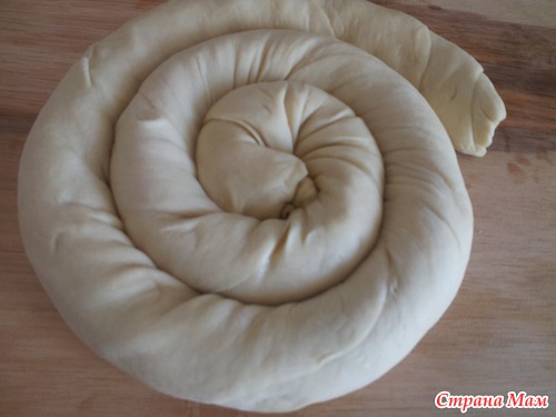 Раскатываем тесто и хорошо намазываем растопленным маргарином или сливочным маслом. Заворачиваем тесто как рулет и поставим в морозильник на 15-20минут.