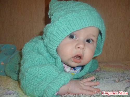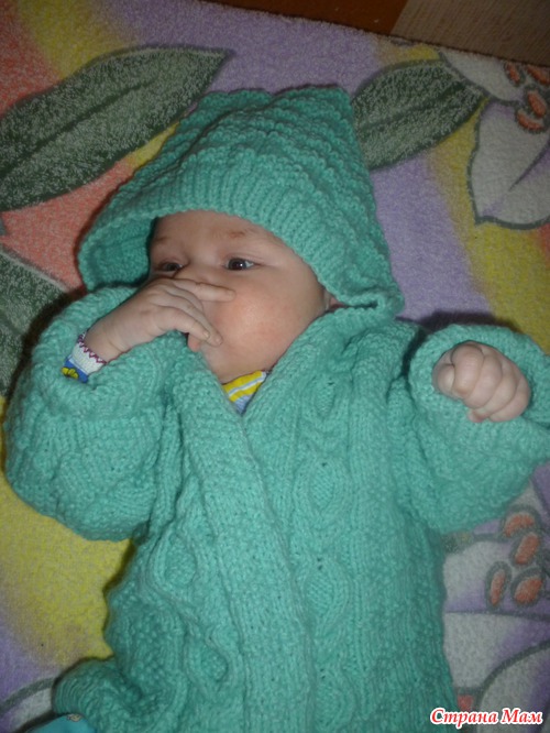 Связался такой жакетик для сыночка, размер 74-80. Нам на весну. Пряжа Baby акрил 100%.100 гр / 400 м. Вязала нитью в два сложения. Ушло 250 гр. Спицы №3.
