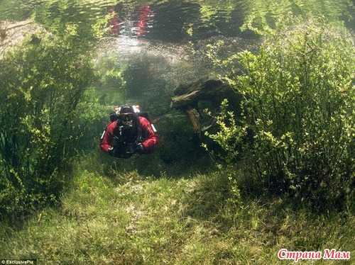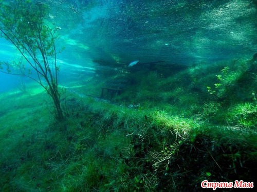 Самое необычное явление в том, что в озере плавают рыбы над деревянными скамейками, а земля покрыта зеленой травой и цветами. Пузырьки воздуха, скопившиеся на листве деревьев, искрятся всеми цветами радуги. Деревья, дороги и мосты — все это создает сюрреалистический наземный мир, но который одновременно находится под слоем воды.