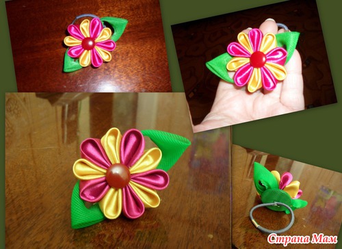 я решила попробовать сотворить цветочек в стиле Канзаши. Осваивала маленький круглый лепесток. Так родилась маленькая резиночка для волос. пока конечно не очень... Пока приклеивала изнаночку помяла и подкривила листик и лепесточки. Надо надо тренироваться. Цветочек первый, но я уверенна -не последний.