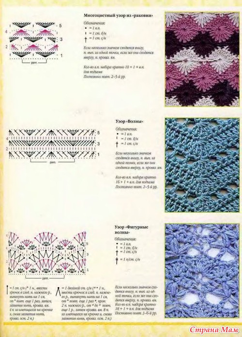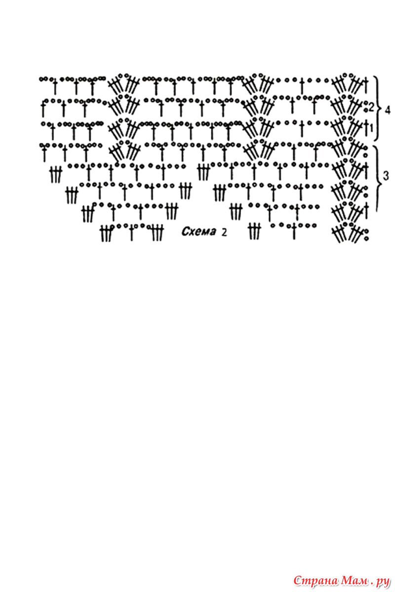 Накидку начните вязать по схеме 1. Провязав все ряды, объединенные в 3 группы, перейдите к схеме 2, на которой обозначены последние ряды третьей группы и первые 3 ряда из четвертой группы. Всего нужно провязать в четвертой группе 10 таких рядов. Затем провяжите 15 рядов по рисунку второго этапа, а в заключение на каждым вторым вертикальным узором провяжите узор «ананас* как в третьем этапе. Закончите вязание 2 рядами СБН.