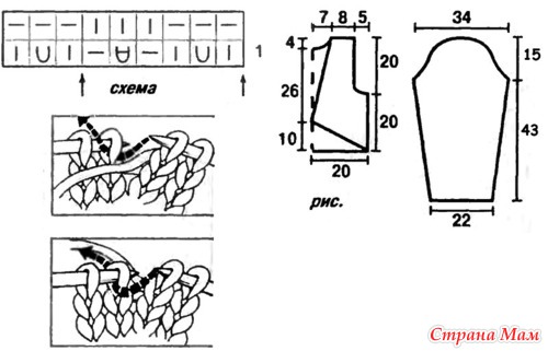 Спинка. Наберите 31 п. Распределите петли: 1 кр. п., 24 п. – узор со снятыми петлями. 5 п. – полупатентная резинка, 1 кр. п. Вяжите, прибавляя со стороны проймы по 1 п. в каждом 3-м ряду, затем в каждом 2-м ряду 4 раза по 1 п. Затем одновременно прибавьте 25 п. На высоте 13 см начните вывязывание горловины, для чего закройте со стороны горловины 3 п., затем убавьте со стороны горловины 3 раза пo 1 п. На высоте 23 см прибавьте со стороны горловины в каждом 2-м ряду 3 раза по 1 п., затем прибавьте в одним ряду 3 п. На высоте 35 см закройте со стороны горловины 25 п., затем убавьте в каждом 2-м ряду 4 раза пo 1 п., затем закройте 3 п. На высоте 40 см закройте оставшиеся петли одним рядом.