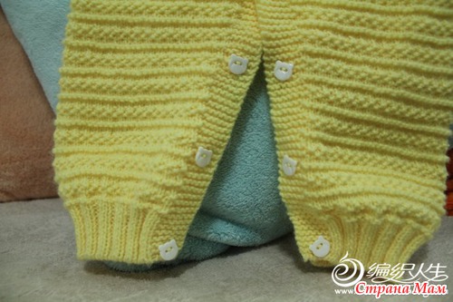 Я буду вязать с пуговками на штанишках, как на образце. Те кто будет вязать без пуговок набирают количество петель на штанину тоже, но вяжут сначала резинку, а потом на высоту штанины рисунком1. Швы в данной модели будут только плечевые, рукав сошьем и в пройму пришьем.