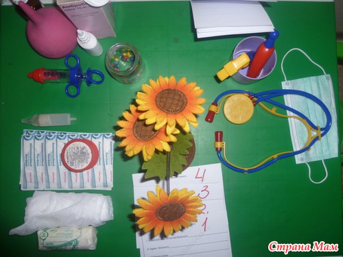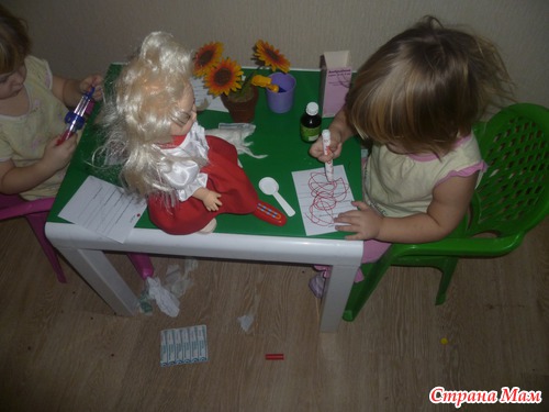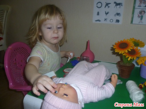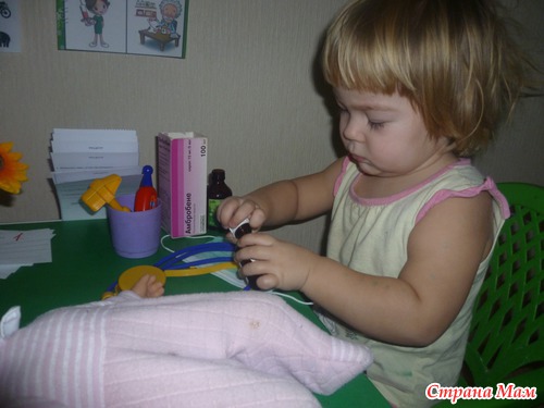 Вкратце рассказала, используя книгу ШСГ какие бывают врачи, вспомнили как ходили к доктору. Рассмотрели какими приспособлениями пользуются врачи. И основным в нашем занятии стала игра в доктора.