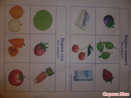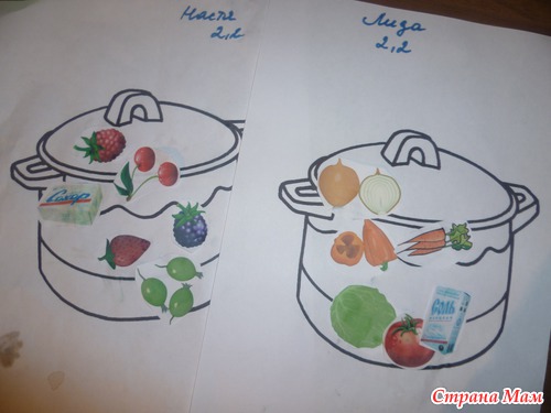 Варили компот и суп. Заранее были приготовлены и разрезаны карточки, в каждом комплекте одна карточка лишняя. То есть из этого продукта ни компот ни суп не сваришь. Настя настойчиво пыталась приклить в свою кастрюлю с кампотом соль, с трудом уговорила этого не делать