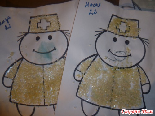 Творчество- доктор из риса. На лице не хватает носа, заостряю на это внимание. Спрашиваю что упустил художник, Настя сразу же выдала ответ, Лиза с наводящими вопросами. Дорисовали недостающую деталь.