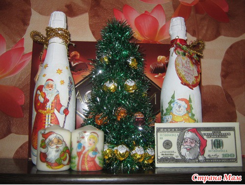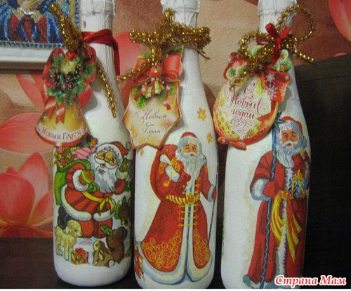 -это мой первый опыт декупажа, да и вообще украшения бутылок