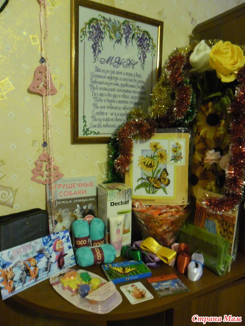 Получили и мы подарок к НГ от http://tiina.stranamam.ru/!!! Огромное спасибо!!! Все прям по заказу!!! Печати и мелки для детей, конфет большая ваза получилась!!! две книжки "вязаные игрушки" и "пошив занавесок"!!! Крем для ручек, а еще ниточки сосо, кольца для обвязки, ленточки атласные, набор вышивки (это для бабушки она у нас оч