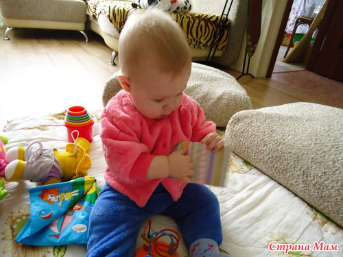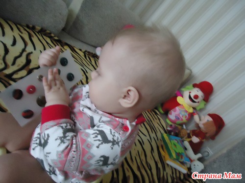 Моей донечке в январе исполнилось 10 месяцев, на сегодняшний день она научилась различать игрушки, которые пищат, гремят, звенят, которые проигрывают мелодии... Одна из любимых игр "Тактили": малявка очень любит разглядывать и трогать предметы на картонных карточках.