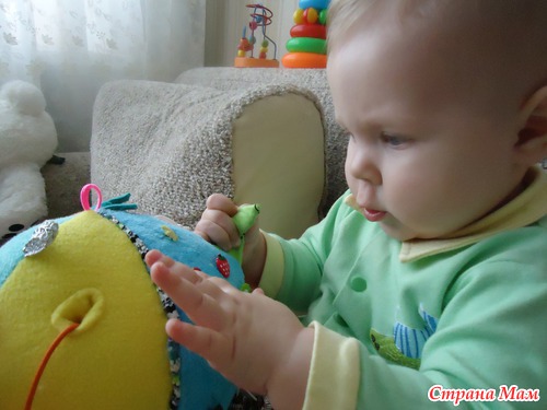 Зато очень любит подаренный мячик: столько всего интересного пришито на его боках!!! И я с легкостью могу заниматься некоторое время своими делами, когда дочка занята его изучением.