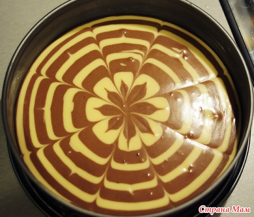 Процесс выкладывания не сфоткала че-то. В общем, в центр чаши наливала 3 ложки одного теста, потом прям сверху(в центр опять) 3 ложки другого и так по очереди, пока тесто не кончится. Порисовала зубочисткой и получилось так: