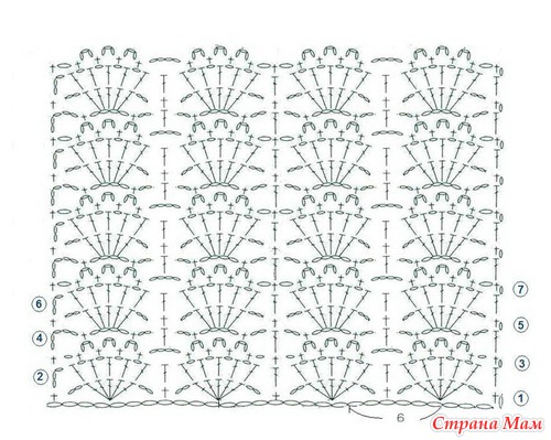 Внимательно рассмотрим наш образец. При высоте раппорта в 4 ряда и длине кокетки 19,5 см нам нужно связать 23 ряда, внося равномерно прибавки в линии схемы.