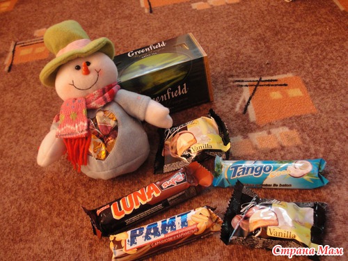 Зеленый чай, который я пью с удовольствием. Конфетки и.. Та да!! СНЕГОВИК, в котором конфеты))