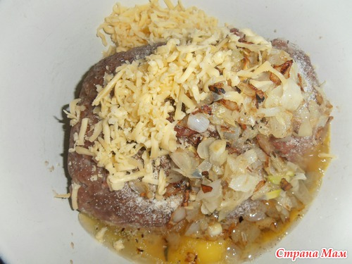 замешиваем фарш, как на обычные котлеты, добавляем натертый сыр и манку, обжаренный лук