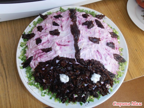. в моем варианте еще и горсть чернослива предварительно замоченного в кипятке, я сделала из него голову и лапки с точками. Из майонеза - глазки. Посадила Божью коровку на травку из зелени лука.