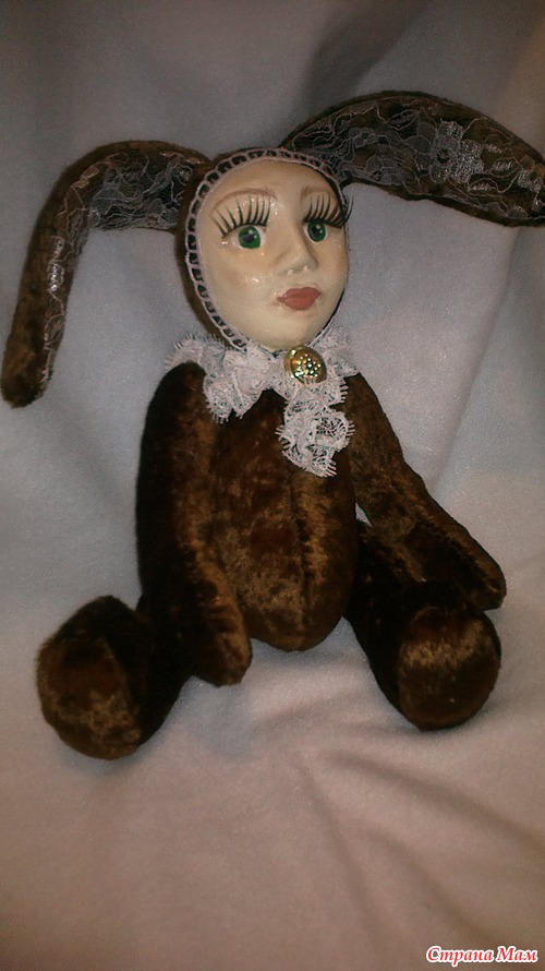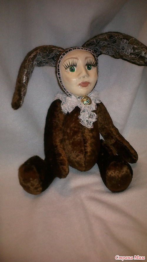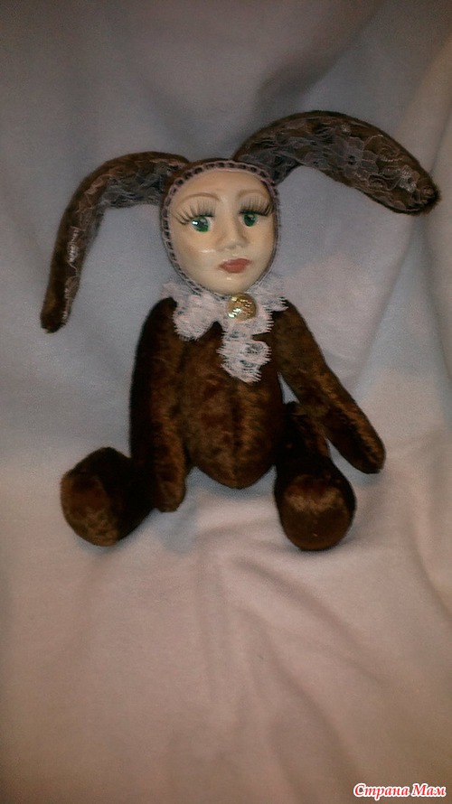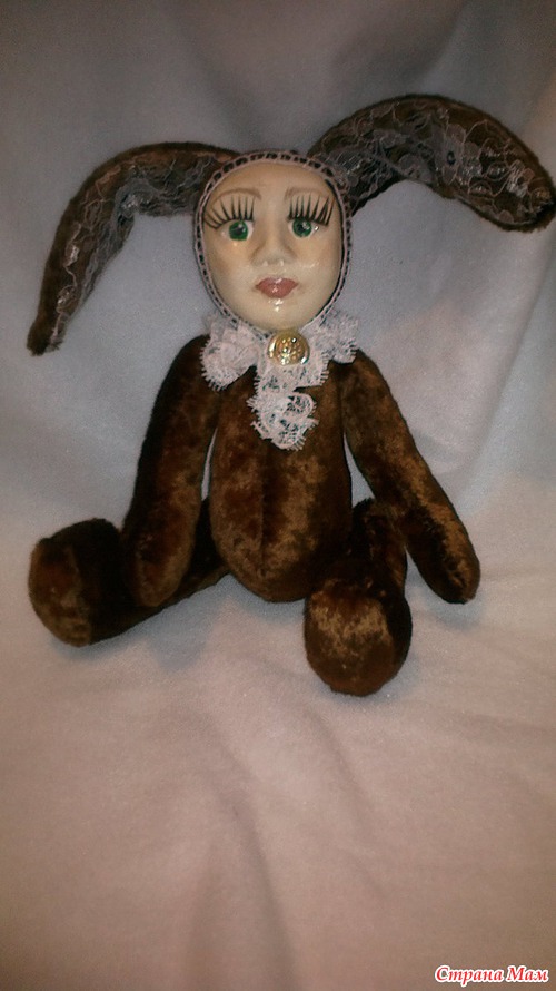Вот, наверное, все в этой кукле не совпадает - тело мишки, уши зайца, лицо детское. Возможно, по этой причине и жутковатое ощущение. Может, если бы цвет плюша был другой, серый, хотя бы, не "мишкин" цвет)). Наверное, надо просто привыкнуть к новому образу?...