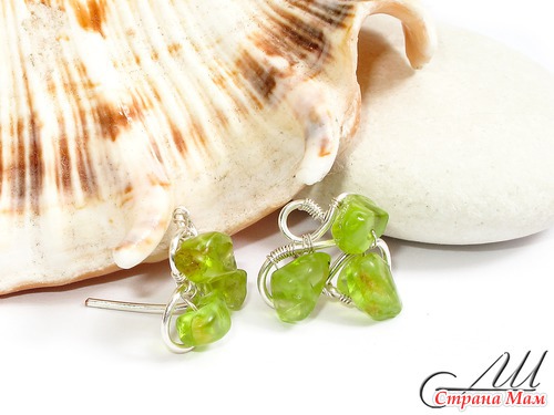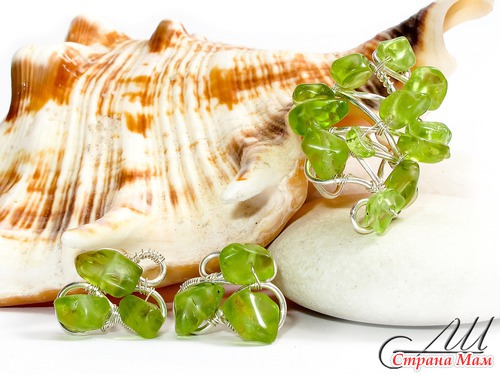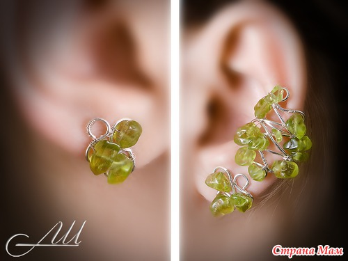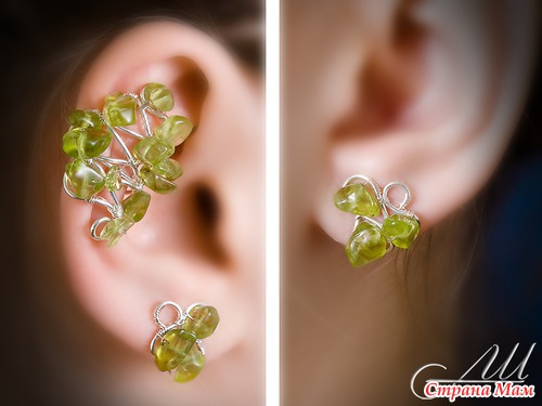 Кафф и две сережки-гвоздика из посеребрённой проволоки и крошки перидота. Комплект выполнен по мотивам работы "Змейка".