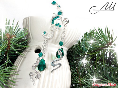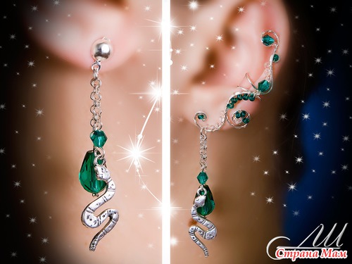 Кафф и сережка "Дочери Скарапеи". Чешский хрусталь и симпатичные змейки.