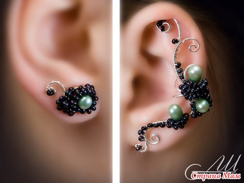 Комплект "Танец лесных нимф" с жемчугом. Кафф на левое ушко и сережка-гвоздик на правое.