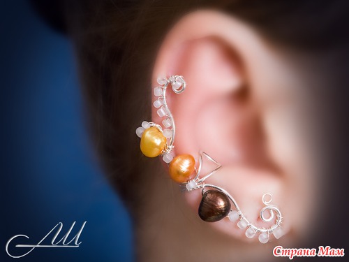 Небольшой кафф на правое ушко "Солнце в ноябре" с цветным жемчугом.
