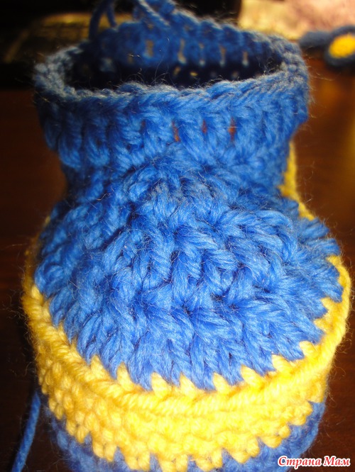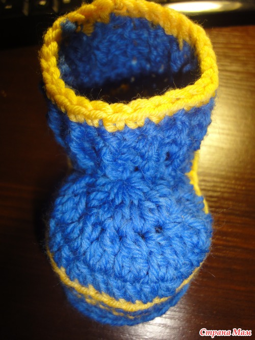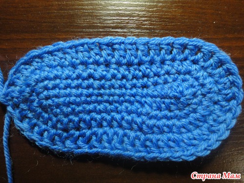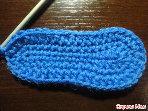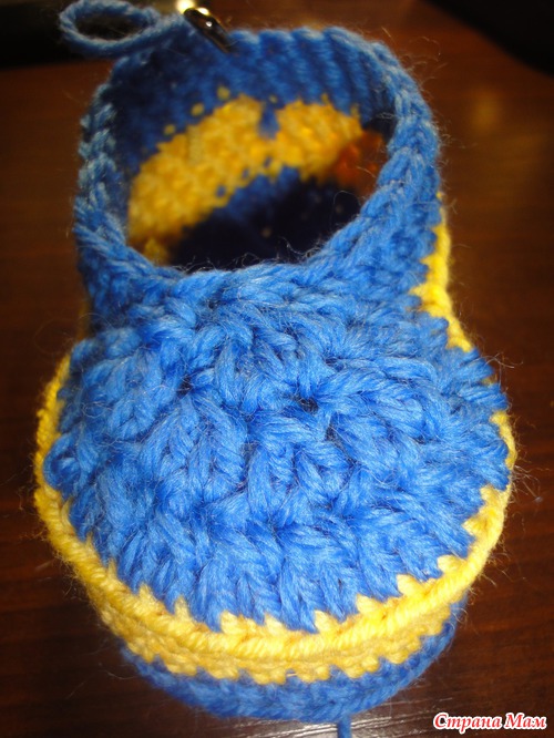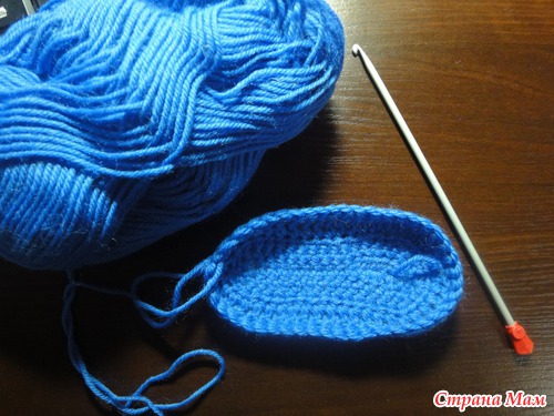 4 круг:3 возд. петли подъема,27 ст с/н(прибавляем еще 3 ст с/н в центре носовой части пинетки), последний столбик соединяем в кольцо с первым. всего 28 петель