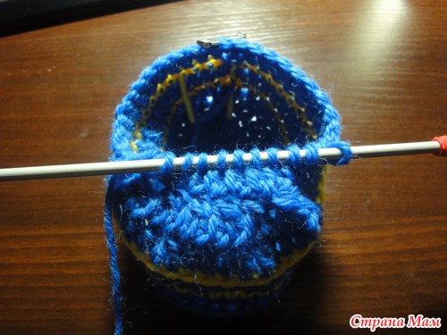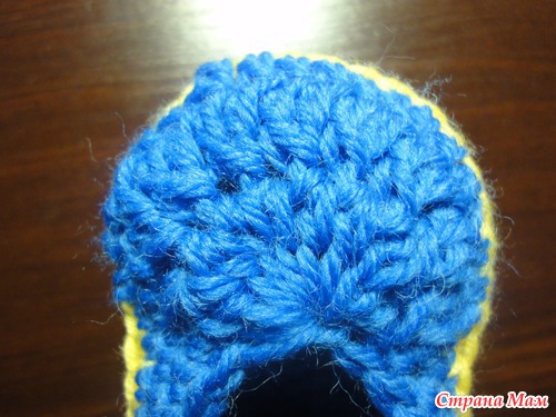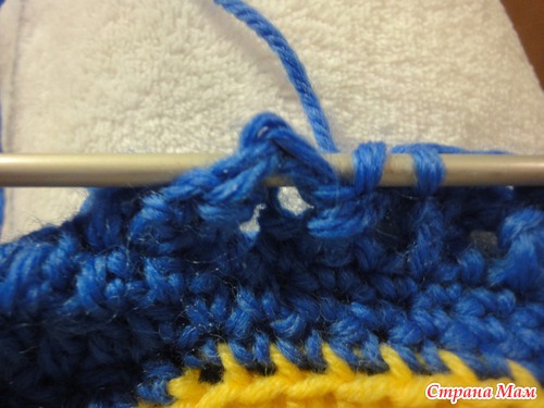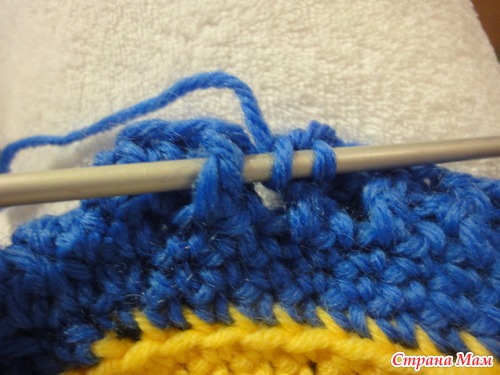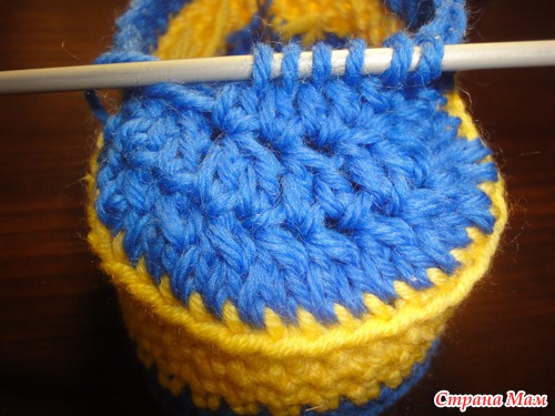 присоединяем пряжу синего цвета в том месте, где оборвали желтую (белую) нить. Вяжем так же по спирали, отмечая первую петлю каждого ряда(чтобы не сбится)
