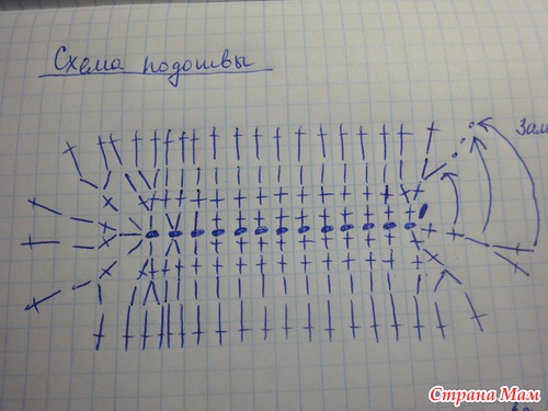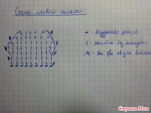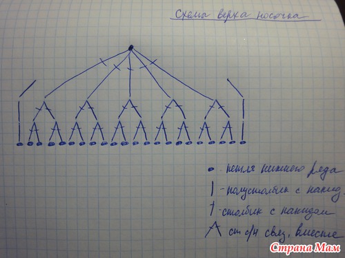 1 круг:вяжем за задние полупетли прошлого ряда-12 ст. б/н,1 п/ст. с нак.,5 ст с/н,2 ст. с/н провязаных вместе,4 ст с/н,2 ст с/н провязаных вместе,5 ст с/н,1 п/ст. с нак.,12 ст б/н. всего 42 петли
