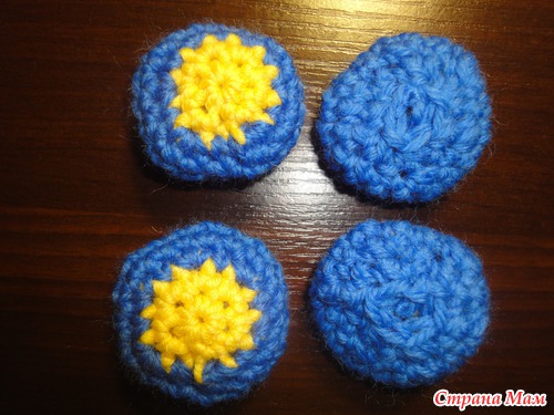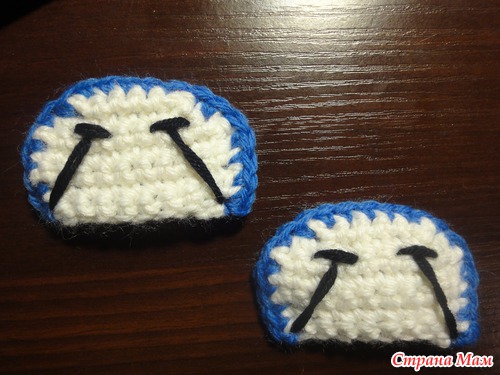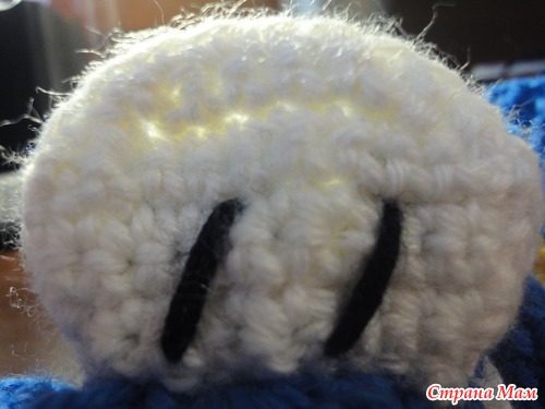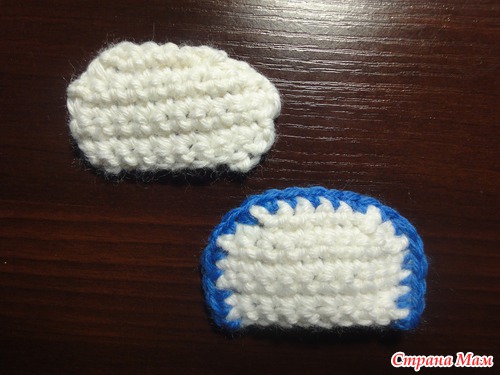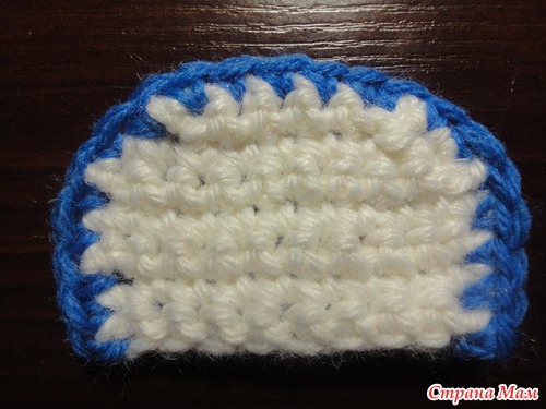 1 круг: синей нитью цепочка из 14возд. петель, ст. б/н во вторую петлю от крючка, ст. б/н в след.9 петель, полуст. с/н в след. петлю, 2 полуст. с/н в след. петлю, 5 ст. полуст. с/н в последнюю воздушную петлю. Теперь вяжем с противоположной стороны начальной цепочки, 2 полуст. б/н в след. петлю, полуст. с/н в след. петлю, ст. б/н в след 7(7,9) петель, 2 ст. б/н в последнюю петлю: получается 32 петли