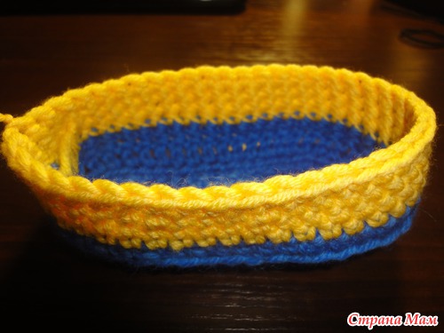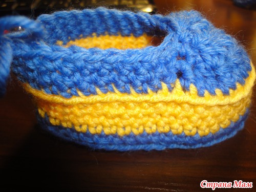 присоединяем желтую (белую) пряжу в том месте, где оборвали синюю нить и вяжем ст. б/н по спирали: 44 петли