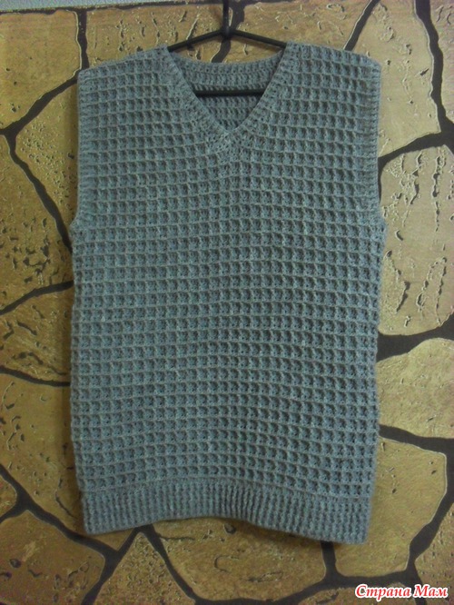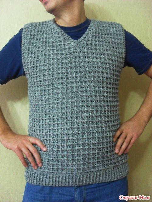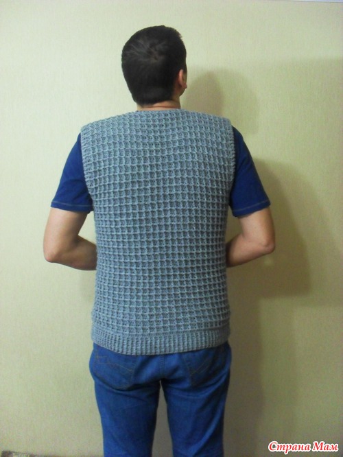 Жилет вязала в подарок. Позирует муж, но он жилеты не любит.