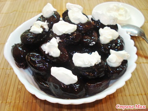 Чернослив залить кипятком, чтобы он стал мягкий. Затем слить воду, вынуть косточки и вместо них вставить кусочки орехов(грецкий, арахис, миндаль, фундук). В конце полить одну часть этой вкусноты мёдом, а другую взбитой сметаной.