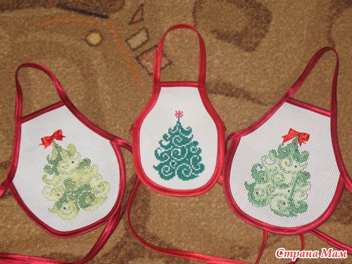 А тут и новый год на носу. Решила нарядить бутылочки и вышила для них фартуки. Но у меня остался только один, другие два (по бокам) подарила. Кстати, боковые фартуки вышивала меланжевыми нитками. Мой первый опыт с такими нитками