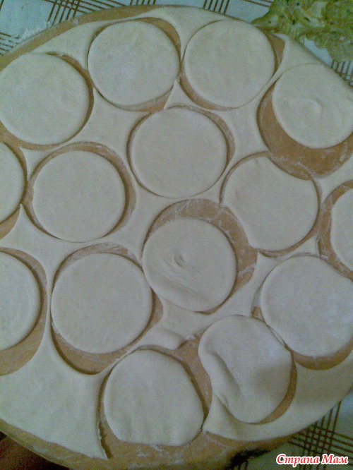Раскатала тонкий пласт и вырезала вот такие кругляшки(можно и квадратики ножом).