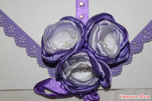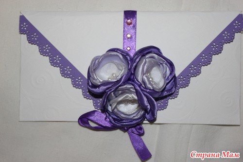 Этот конвертик маме на ДР. Применила цветочки канзаши.