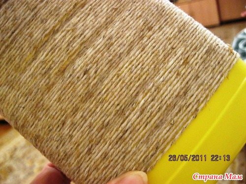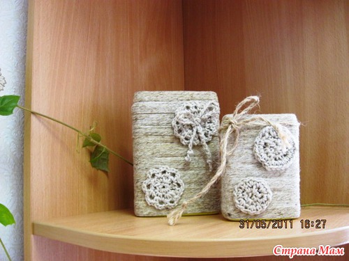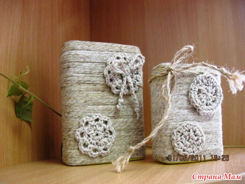 Нитки х/б приклеиваем по периметру баночки на клей ПВА. Крючком вывязываем декор (кстати, декор может быть любым!), дополняем веревочкой. ВСЁ!.