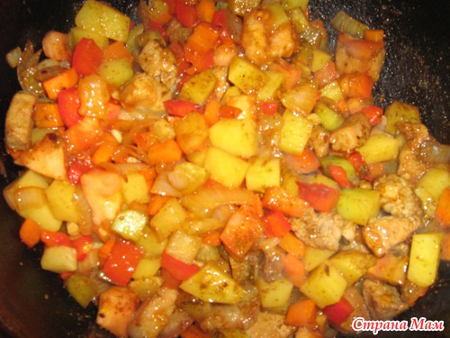 Мясо и все овощи режу кубиками. Обжариваю в казане. Я масло не использую, разогреваю казан бросаю туда мясо, от него образуется и жир и сок, жарю пока не посветлеет все, потом закладываю все овощи, по-очереди каждый раз перемешивая и немного обжаривая.