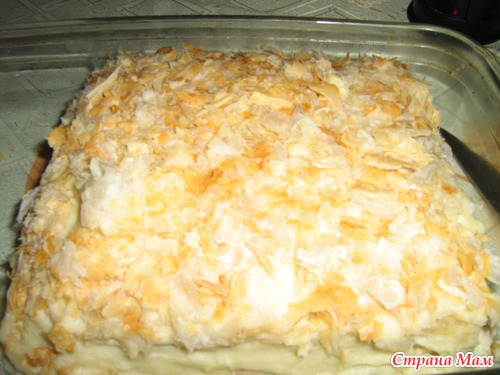 Оно поднимается очень хорошо, можно на 2-3 части разрезать потом. Укладываем в форму и промазываем кремом каждый слой.