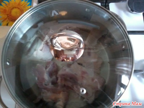 кастрюлю ставим на огонь и доводим до кипения. Огонь убавляется до минимума и с бульона снимается вся пена.