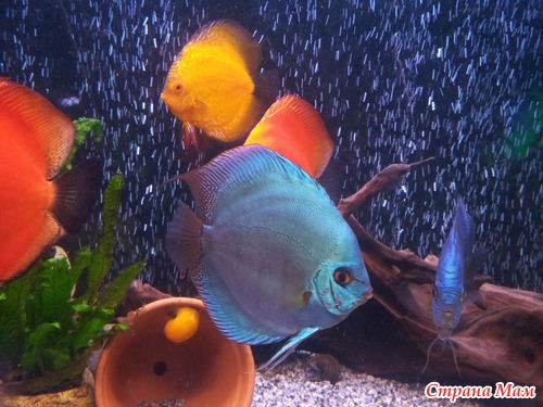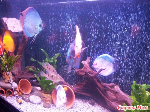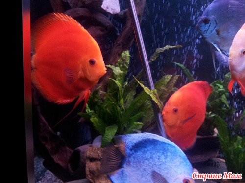 у меня на 1000 литров 11 дисков (каждого цвета по паре)4 геофагуса демона,4 стурисомы панамские,сомы 3-панак204,5-корнишон200,2-сом анциструс ред.ну и ампуляшки.очень тяжело отсаживать,нужна трофяная вода и сначала они 10дней должны сидеть на матери