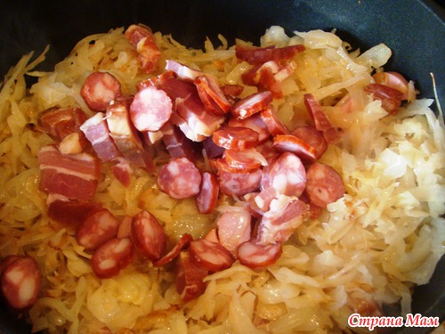Подготовительный этап заключается в нарезании/шинковке всех составляющих. Капусту шинкуем соломкой, лук нарезаем полу или четверть кольцами, копчености небольшими кусками.