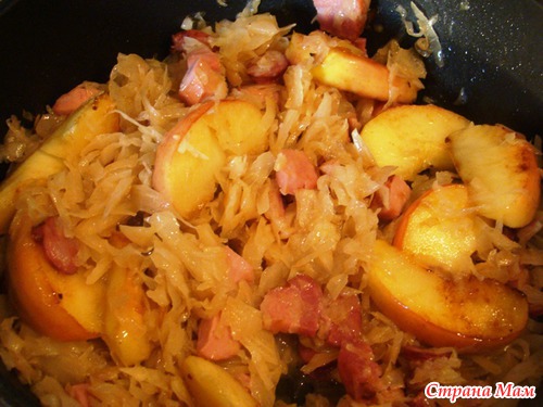Пока сковорода для яблок нагревается, самое время добавить к капусте копчености, перемешать, немного прогреть и залить вином, добавить перец и тмин. Убавить огонь до минимума и оставить тушить под крышкой, периодически заглядывая и мешая.