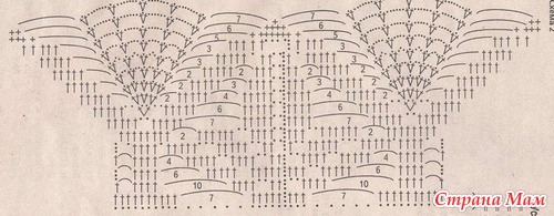 Затем на цепочке из возд. п. большей длины провяжите 9 раппортов кружевной каймы по схеме 2, сомкните вязание в круг и обрежь¬те лишние петли цепочки.