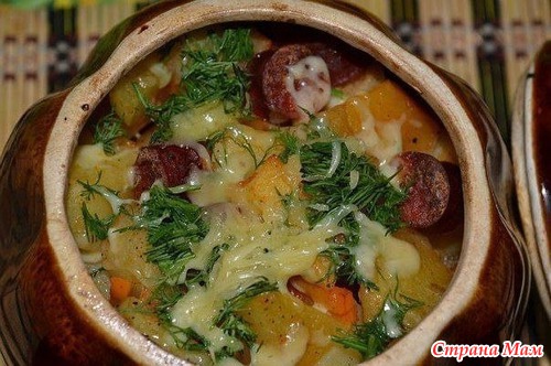 Почистить картошку нарезать кубиками, затем нарезать колечками колбаску охотничью, обжарить морковь и чуть томатной пасты с водичкой. Все в картофель. Добавить чеснок, соль, перец, гвоздику. Все перемешать и ставить в горшочках в духовку на 45 минут, затем вытянуть и добавить сыр и зелень