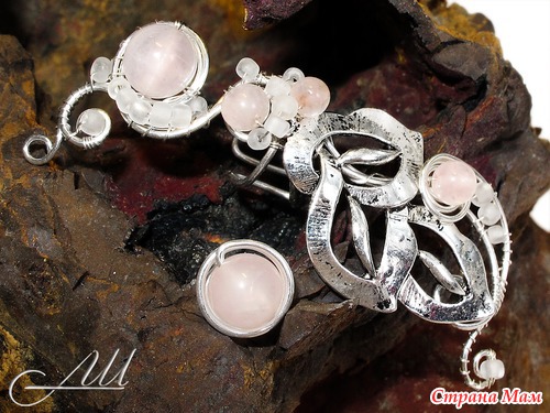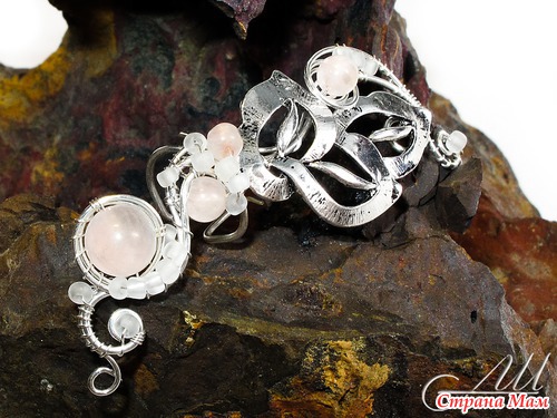 Материалы: Посеребрённая немецкая проволока, бусины натурального розового кварца (Индия), бисер, металлические листики