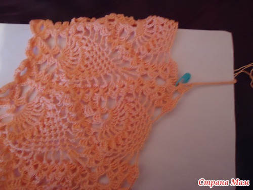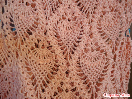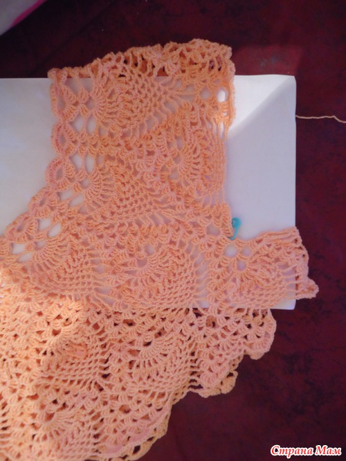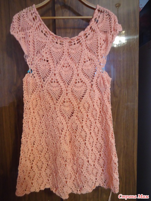 Платье у меня будет без рукавов. Я вязала-вязала, а когда дошла до груди, поняла, что оно мне велико. У меня размер 42. Все делала строго по описанию. Сначала хотела распустить и переделать схему "под себя", убрать лишние ананасы, но ко мне приехала крестная и сказала, чтоб я не распускала, а довязала его и она у меня платье заберет, только она захотела его без рукавов. У крестной размер 48. Но платье из моей пряжи подойдет и на 50р-р.